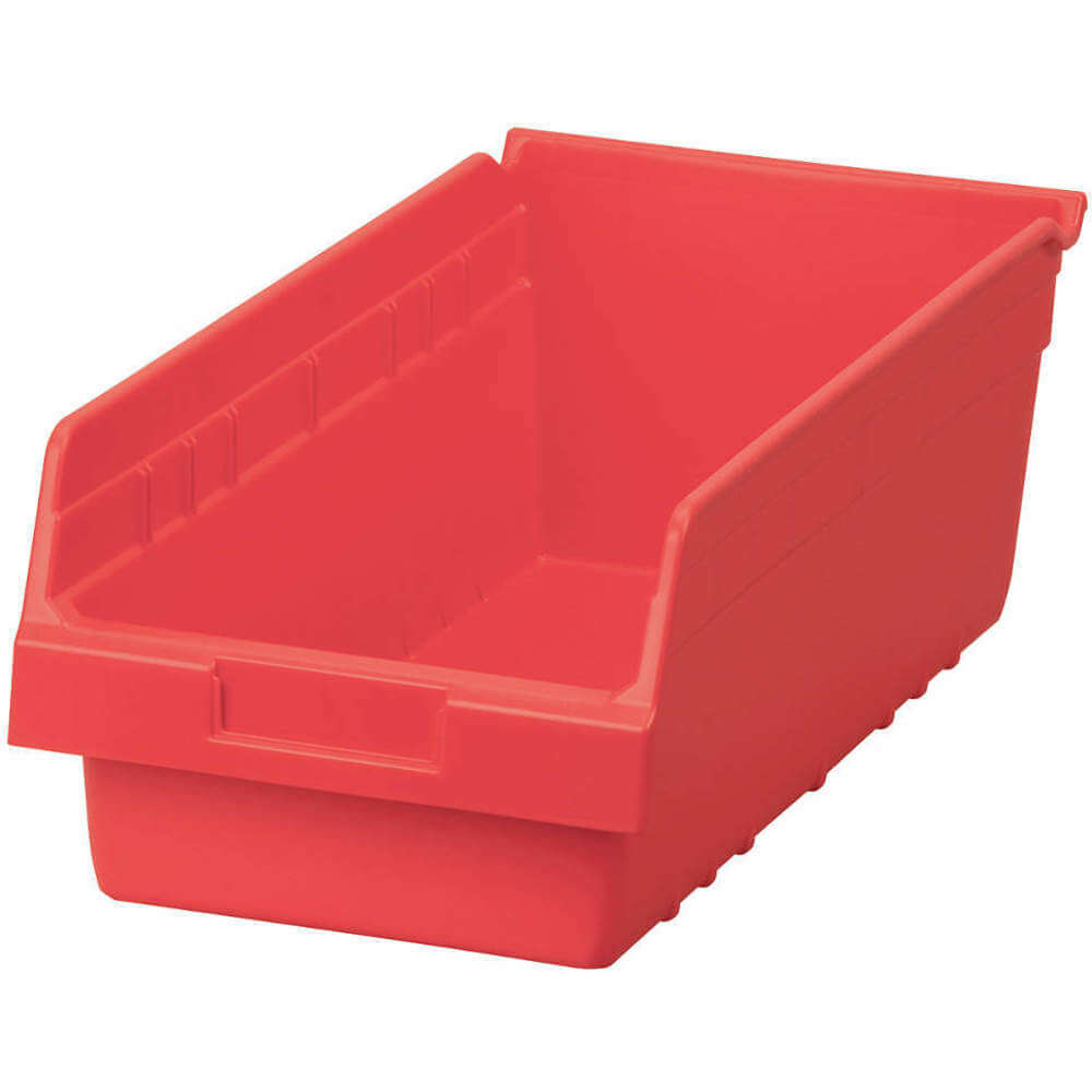 - These 6-inch-tall shelf bins nest one inside the other when they are empty or when filled, creating sturdy storage units on steel and wire shelving.