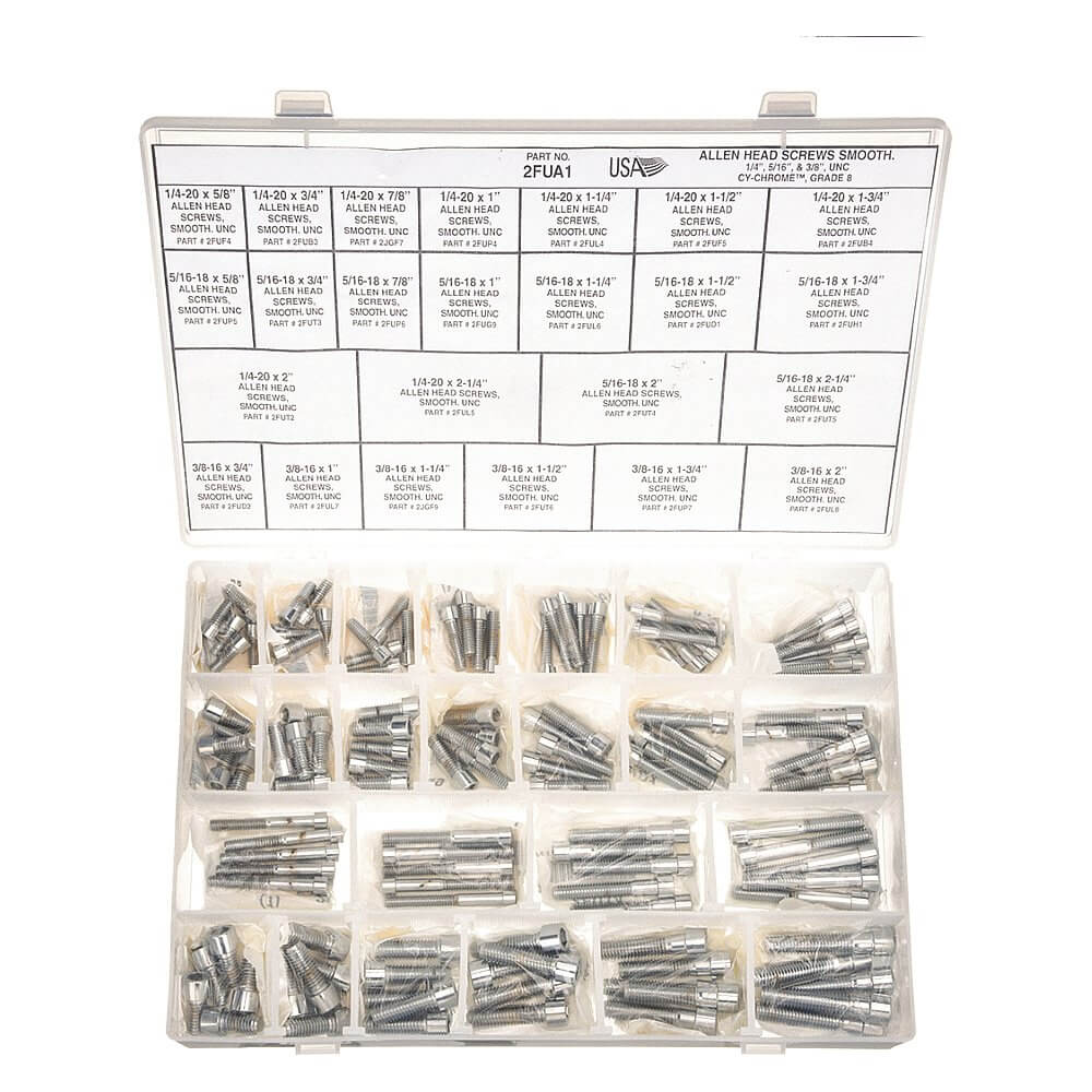 | Includes | (5) Each: 1/4"-20 X 5/8", 1 1/2", 3/8"-16 X 3/4", 5/16"-18 X 5/8", Plastic Container, X1 1/2", X1 1/4", X1 3/4", X1", X2 1/4", X2", X3/4", X7/8" |