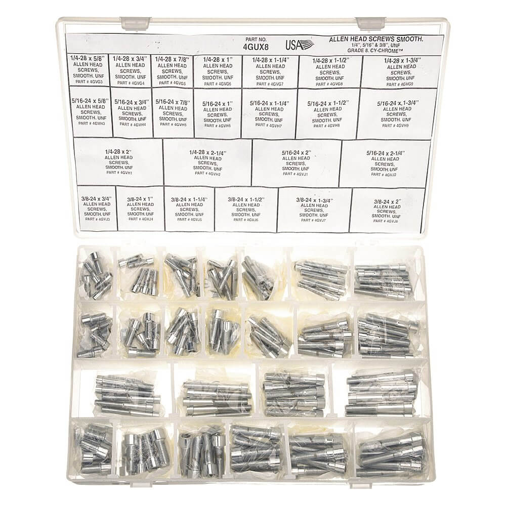 | Includes | (5) Each: 1/4"-28 X 5/8", 3/8"-24 X 3/4", 5/16"-24 X 5/8", Plastic Container, X1 1/2", X1 1/4", X1 3/4", X1", X2 1/4", X2", X3/4", X7/8" |