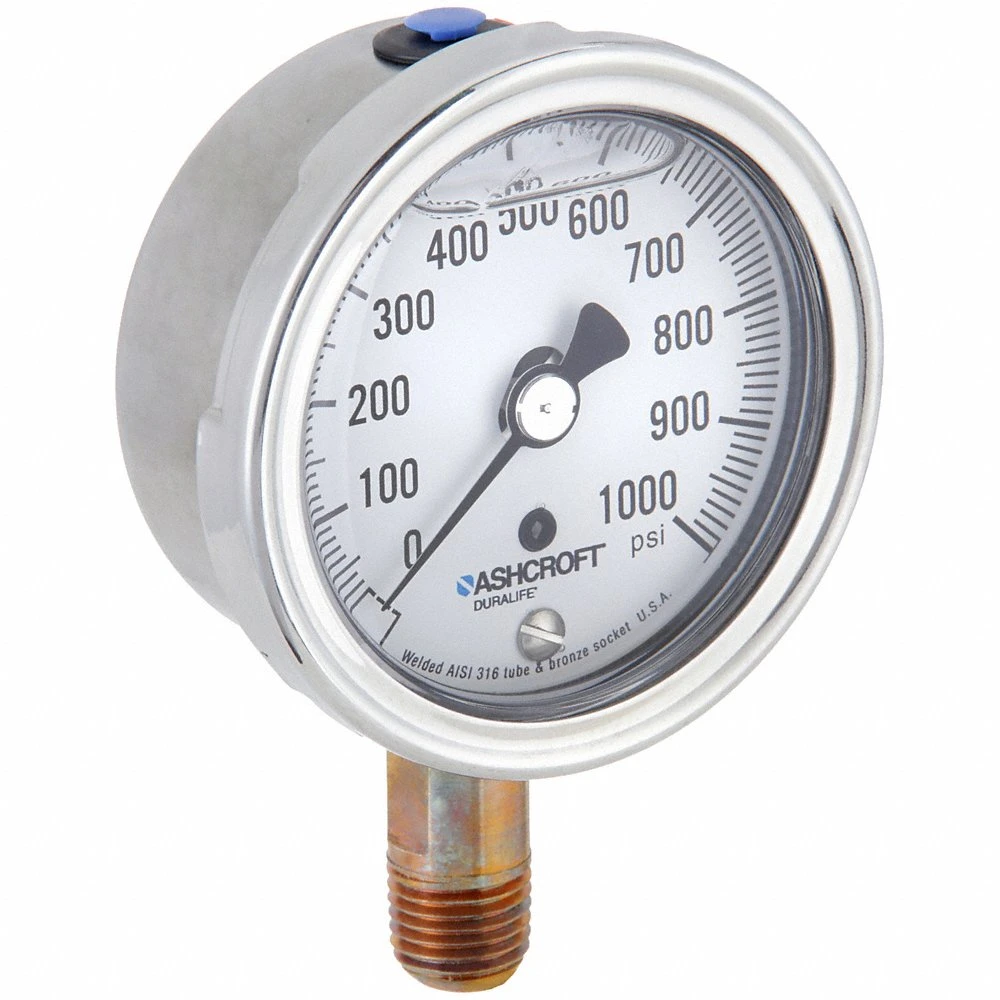 ASHCROFT 251009AWL02L1000# Industrial Pressure Gauge, 0 to 1000 PSI, 2 1/2 in Dial, Liquid-Filled, 1/4 in NPT Male