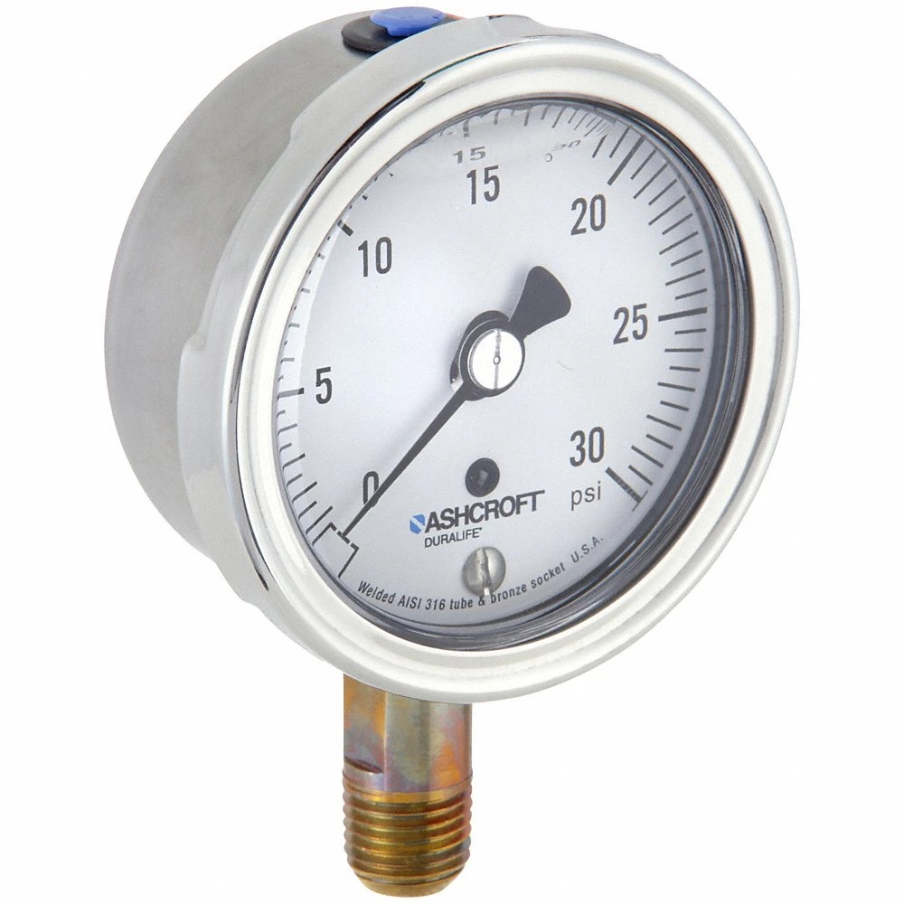 ASHCROFT 251009AWL02L30# Industrial Pressure Gauge, 0 PSI / Hg to 30 PSI, 2 1/2 in Dial, 1/4 in NPT Male, Bottom