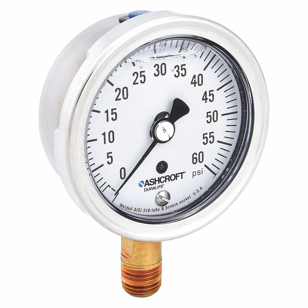 ASHCROFT 251009AWL02L60# Industrial Pressure Gauge, 0 To 60 PSI, 2 1/2 Inch Dial, Liquid-Filled, 1/4 Inch Npt Male