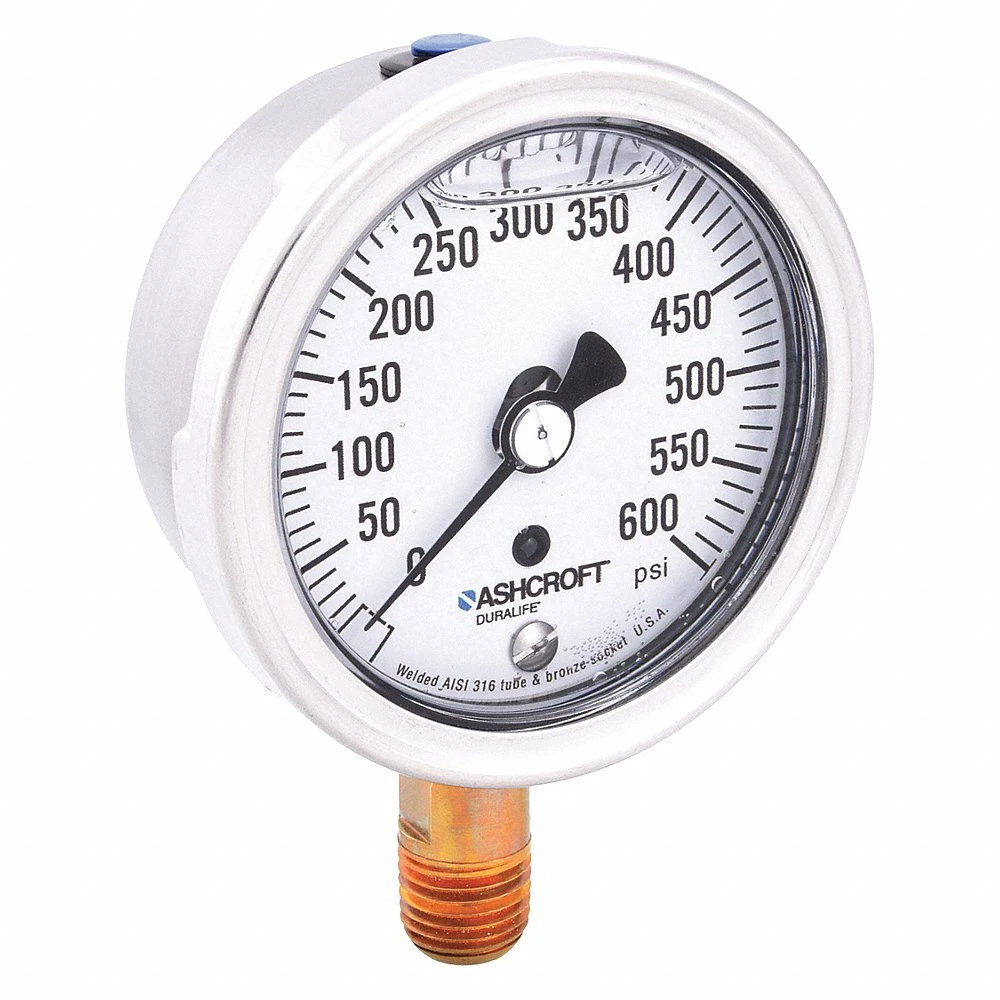 ASHCROFT 251009AWL02L600# Industrial Pressure Gauge, 0 PSI / Hg to 600 PSI, 2 1/2 in Dial, 1/4 in NPT Male, Bottom