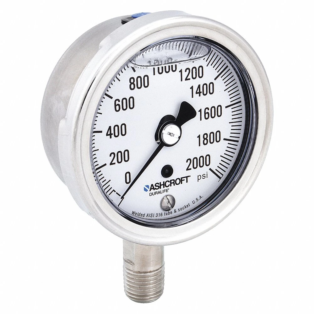ASHCROFT 251009SWL02L2000# Industrial Pressure Gauge, 0 to 2000 PSI, 2 1/2 in Dial, Liquid-Filled, 1/4 in NPT Male