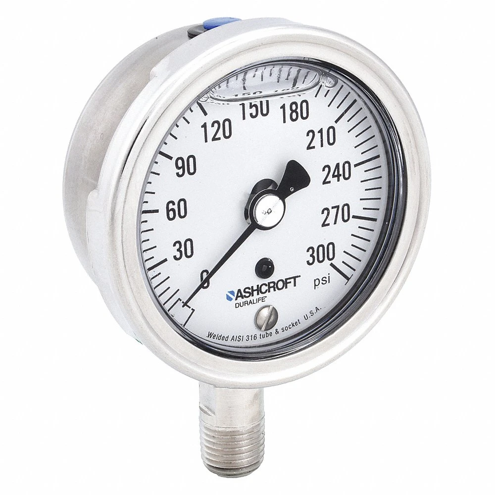 ASHCROFT 251009SWL02L300# Industrial Pressure Gauge, 0 PSI / Hg to 300 PSI, 2 1/2 in Dial, 1/4 in NPT Male, Bottom