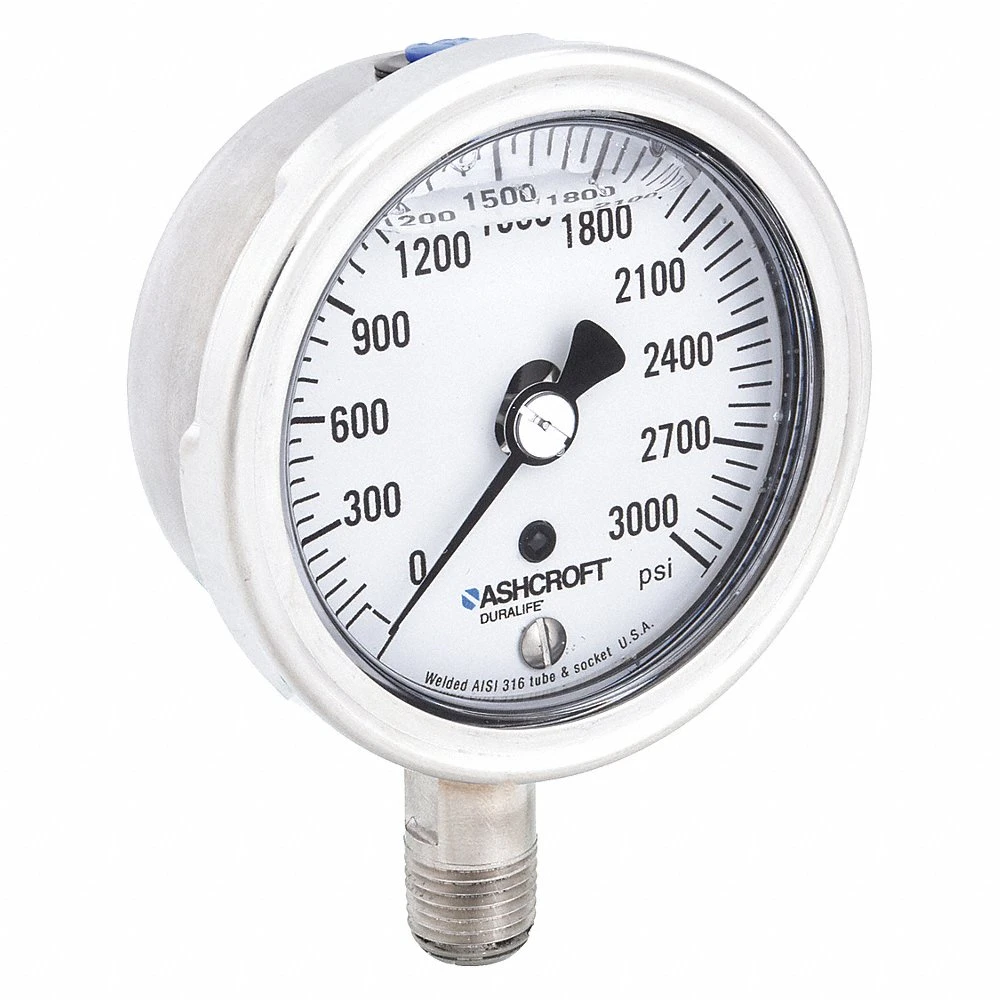 ASHCROFT 251009SWL02L3000# Industrial Pressure Gauge, 0 PSI / Hg to 3000 PSI, 2 1/2 in Dial, 1/4 in NPT Male, Bottom