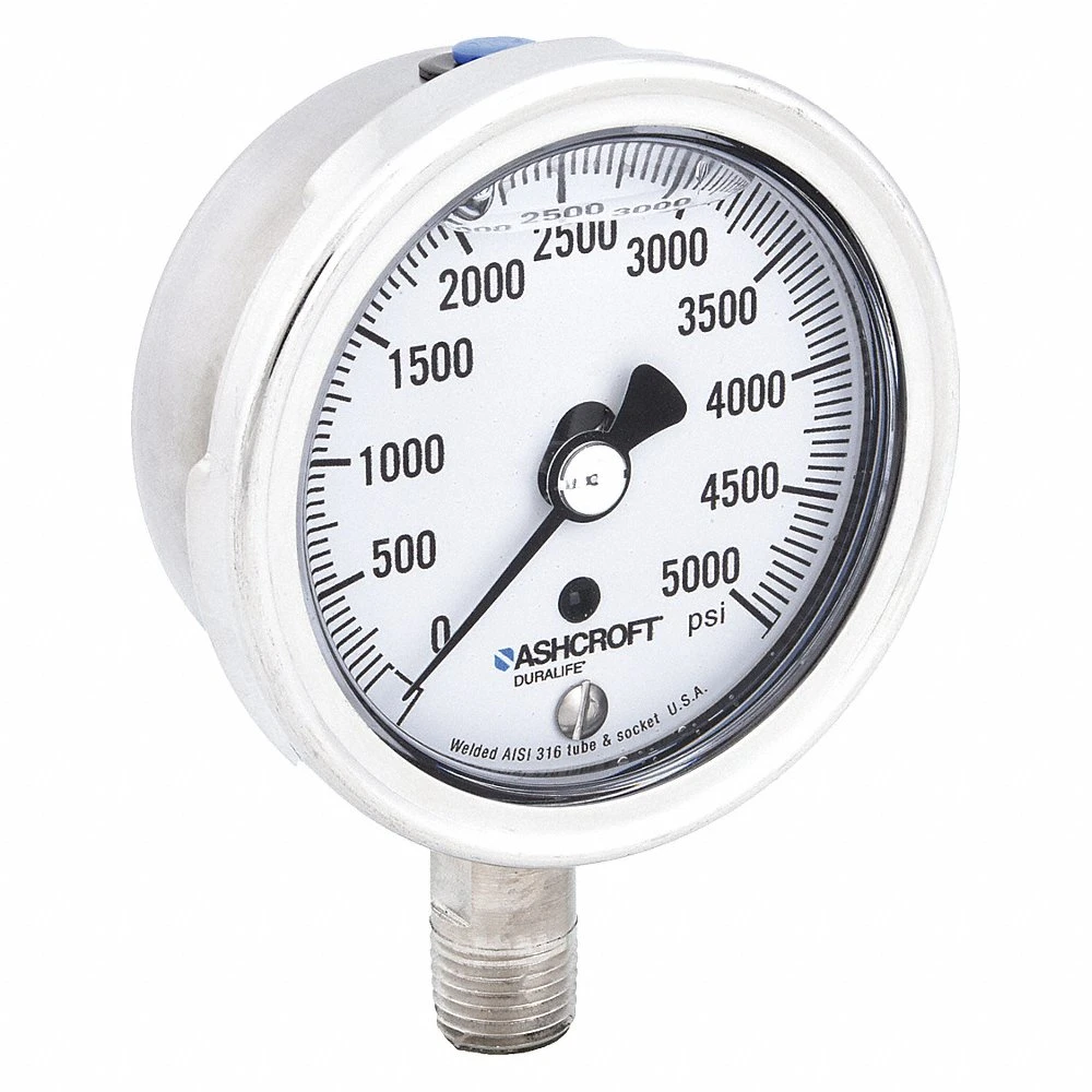 ASHCROFT 251009SWL02L5000# Industrial Pressure Gauge, 0 to 5000 PSI, 2 1/2 in Dial, Liquid-Filled, 1/4 in NPT Male