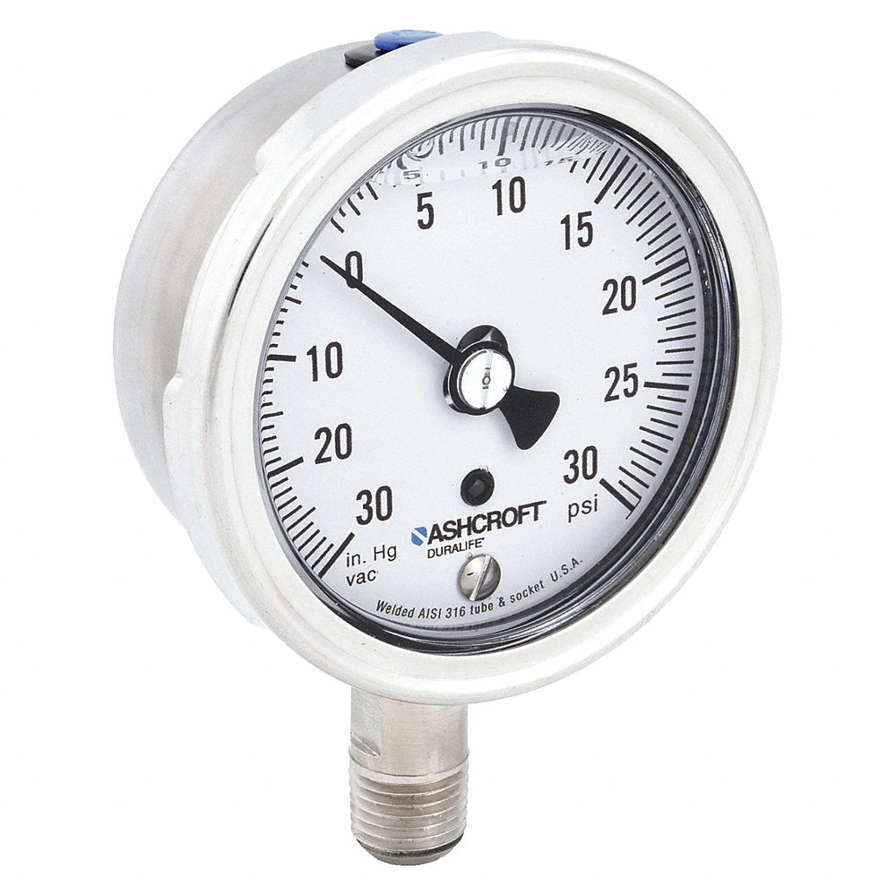 ASHCROFT 251009SWL02LV/30# Industrial Compound Gauge, 30 in Hg to 0 PSI/Hg to 30 PSI, 2 1/2 in Dial, 1/4 in NPT Male