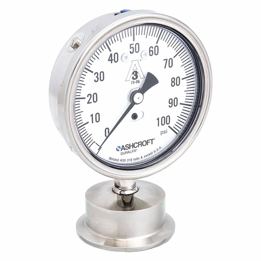 ASHCROFT 35-1032S-20L-100 Pressure Gauge, 0 to 100 PSI, 3 1/2 Inch Dial, 2 Inch Tri-Clamp, Bottom, ±1.50% Accuracy