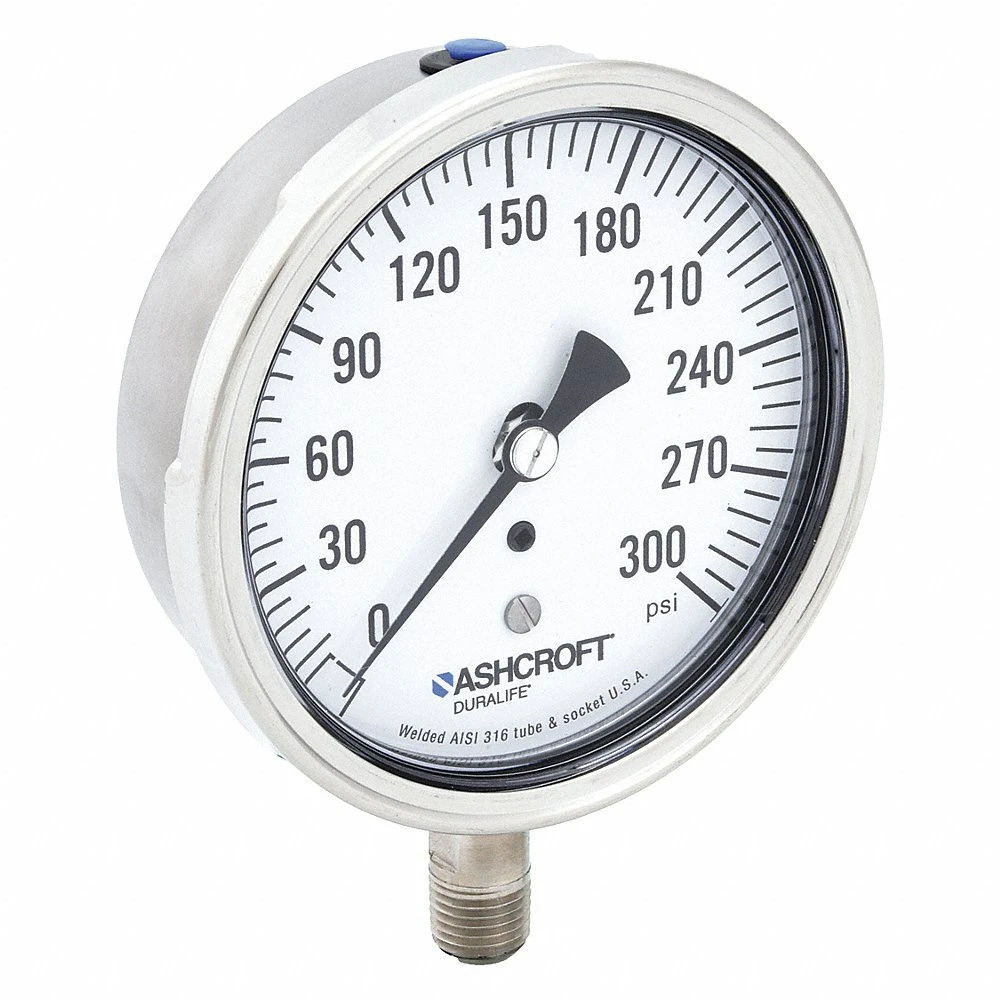 ASHCROFT 351009SW02L300# Industrial Pressure Gauge, 0 PSI / Hg to 300 PSI, 3 1/2 in Dial, 1/4 in NPT Male, Bottom