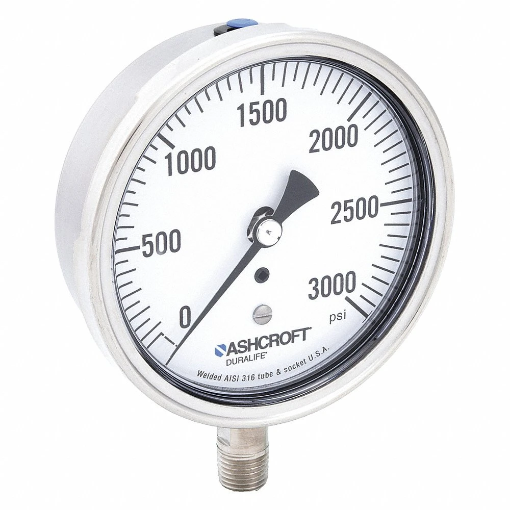 ASHCROFT 351009SW02L3000# Industrial Pressure Gauge, 0 PSI / Hg to 3000 PSI, 3 1/2 in Dial, 1/4 in NPT Male, Bottom