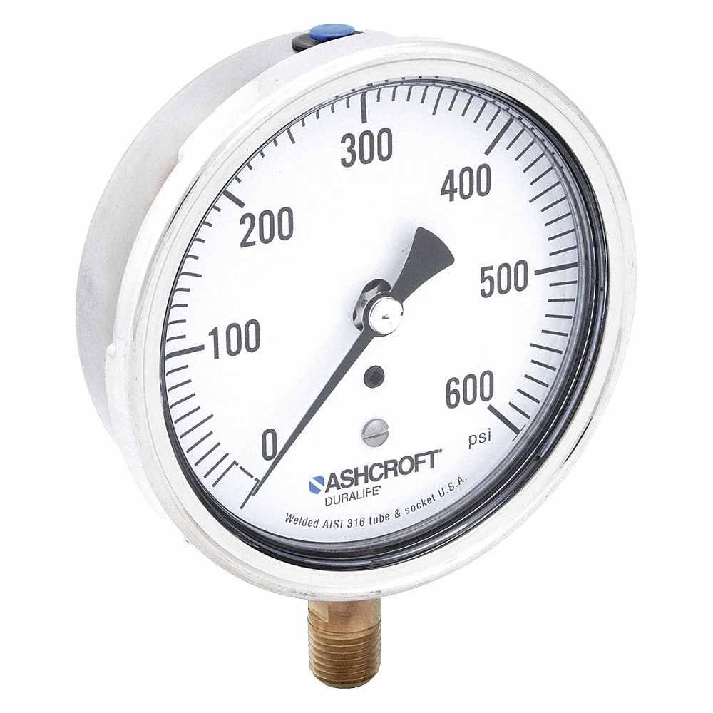 ASHCROFT 351009SW02L600# Industrial Pressure Gauge, 0 PSI / Hg to 600 PSI, 3 1/2 in Dial, 1/4 in NPT Male, Bottom