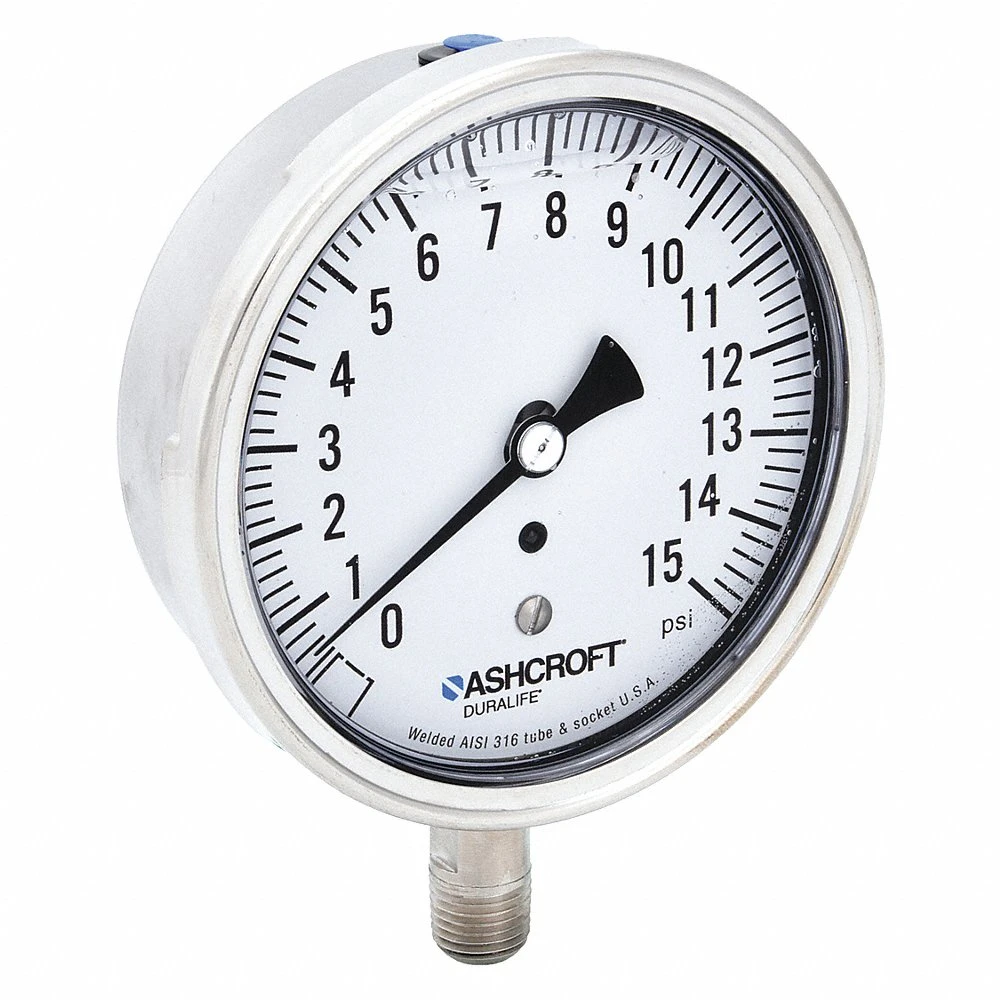 ASHCROFT 351009SWL02L15# Industrial Pressure Gauge, 0 To 15 PSI, 3 1/2 Inch Dial, Liquid-Filled, 1/4 Inch Npt Male
