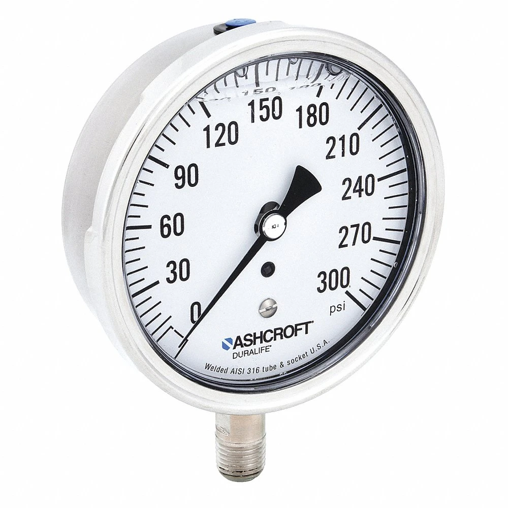 ASHCROFT 351009SWL02L300# Industrial Pressure Gauge, 0 PSI / Hg to 300 PSI, 3 1/2 in Dial, 1/4 in NPT Male, Bottom