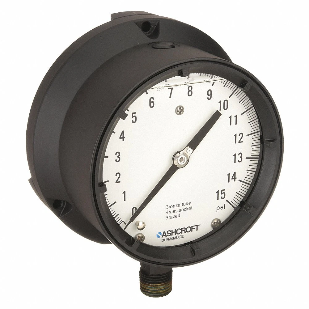 ASHCROFT 451379ASL04L15# Process Pressure Gauge, 0 to 15 PSI, White, 4 1/2 in Dial, 1/2 in NPT Male, Aluminium