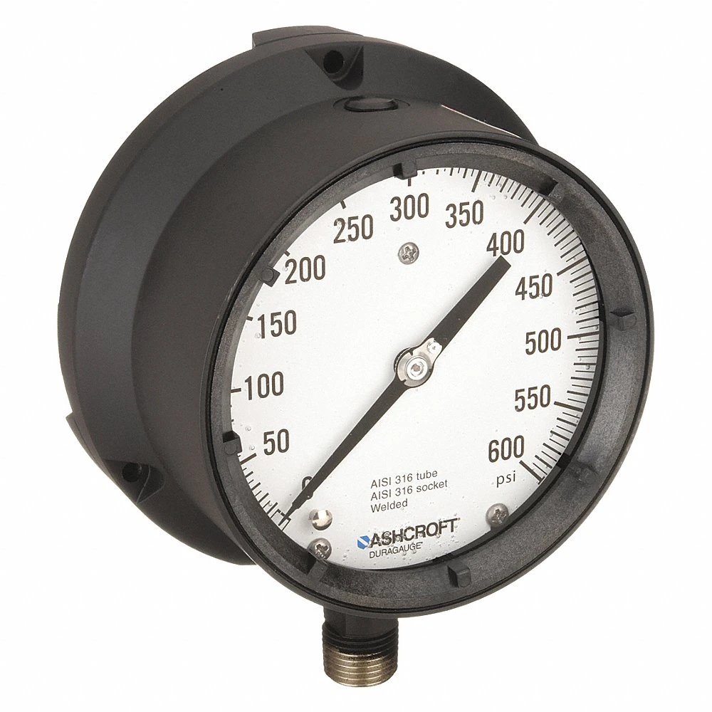 ASHCROFT 451379SSL04L600# Process Pressure Gauge, 0 to 600 PSI, White, 4 1/2 in Dial, 1/2 in NPT Male, Aluminium