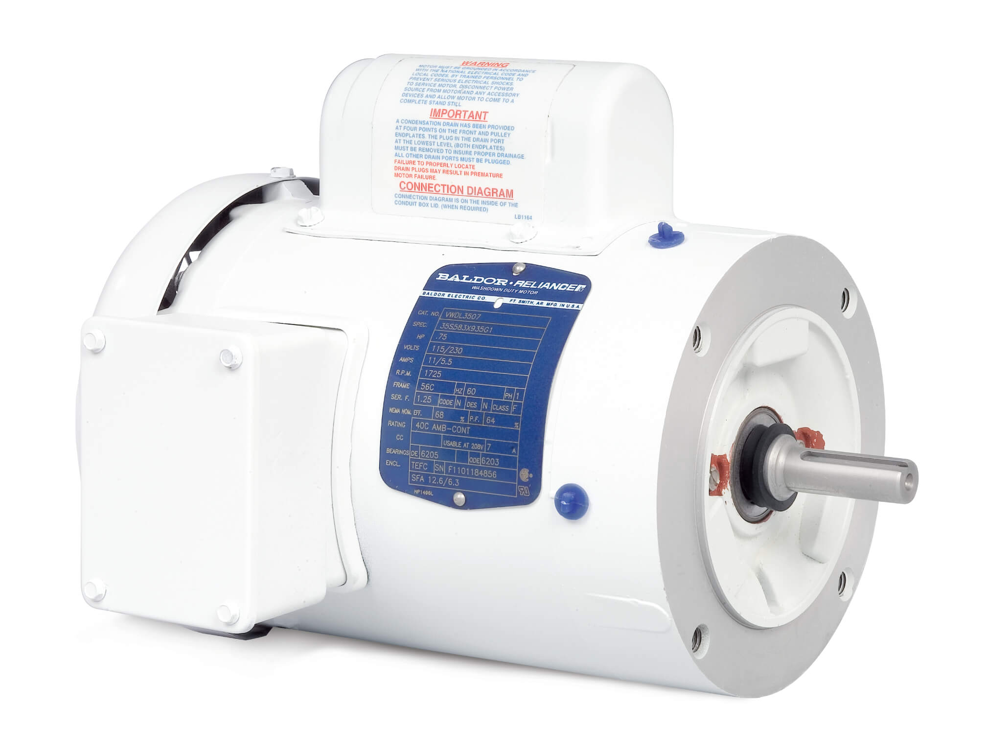 BALDOR MOTOR VWDL3504 White Washdown Motor, 115/230V, 1800 RPM, 60 Hz, 0.5 hp, TEFC, 56C Frame