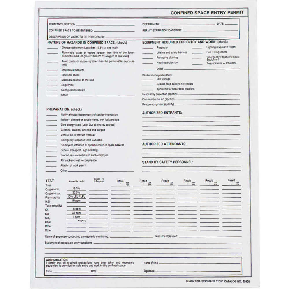 BRADY 65936 Confined Space Entry Permit, 8 1/2 Inch x 11 Inch, Black/White, Paper