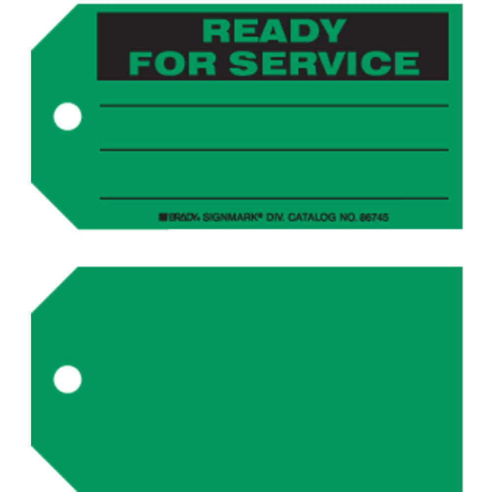 BRADY 86745 Tag, Ready For Service, 3 x 5 3/4 Inch, Green, Rectangle, Indoor, English, Cardstock