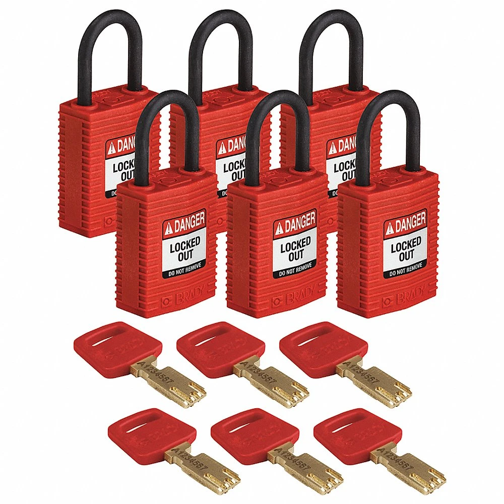 BRADY CPT-RED-25PL-KA6PK 150198 Lockout Padlock, Keyed Alike, Nylon, Compact Body Size, Plastic, Red