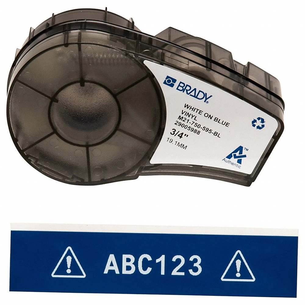 BRADY M21-750-595-BL 142794 Label Roll Cartridge, 3/4 Inch x 21 ft, Autoclavable Vinyl, White on Blue, Indoor/Outdoor