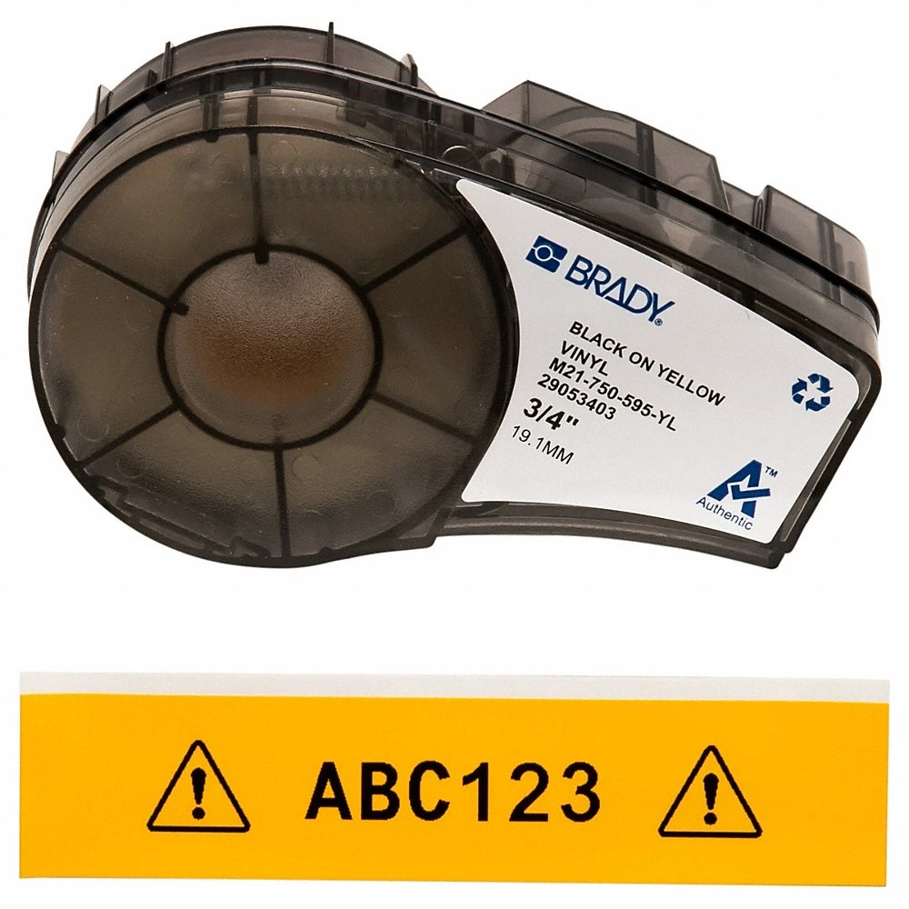BRADY M21-750-595-YL 142811 Label Roll Cartridge, 3/4 in x 21 ft, Autoclavable Vinyl, Black on Yellow, Indoor/Outdoor