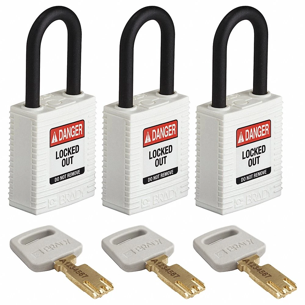 BRADY NYL-WHT-38PL-KA3PK Lockout Padlock, Keyed Alike, Nylon, Standard Body Size, Plastic, White