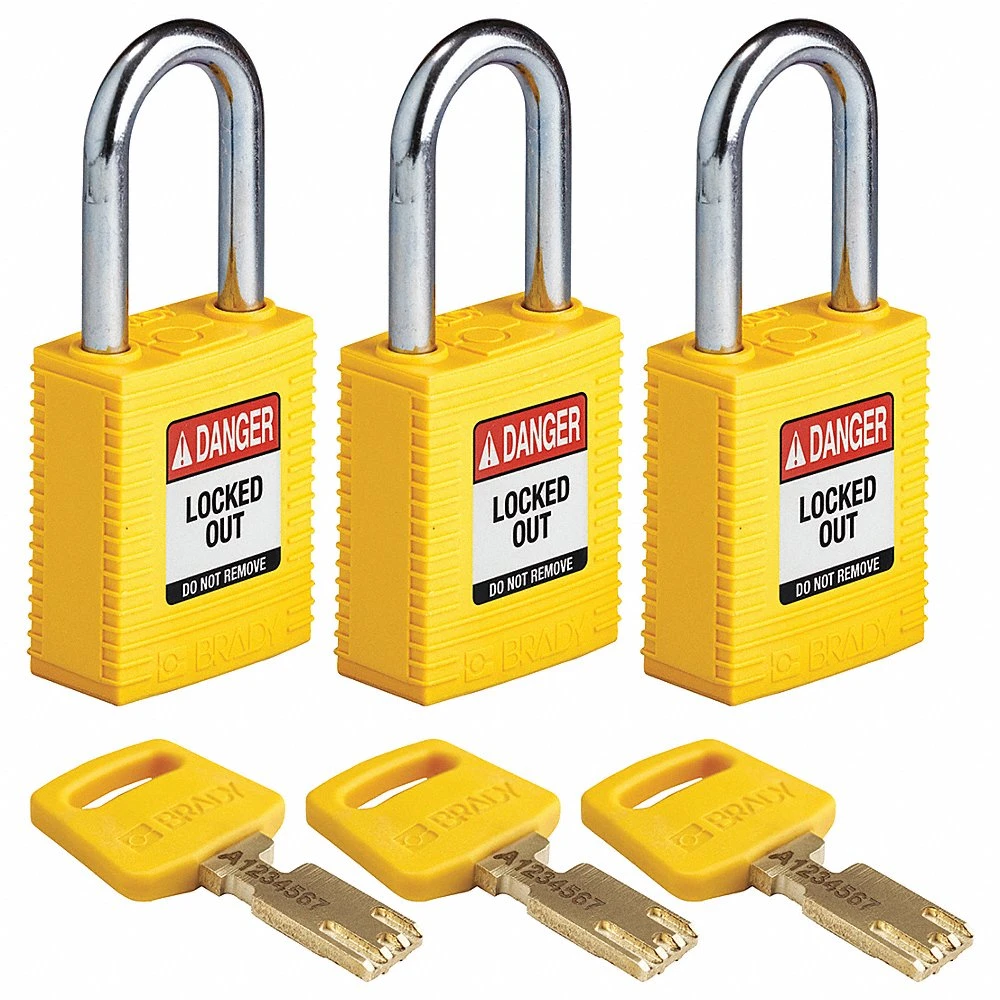 BRADY NYL-YLW-38ST-KA3PK 150246 Lockout Padlock, Keyed Alike, Nylon, Standard Body Size, Steel, Yellow