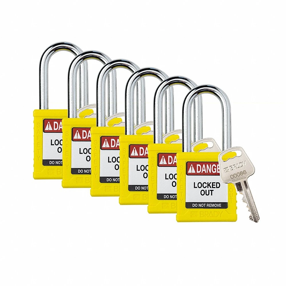 BRADY SDPL-YLW-38ST-KD6 153458 Padlock, Keyed Different, Nylon, Standard Body Size, Steel, Yellow