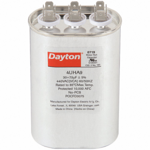 DAYTON 4UHA9 Motor Dual Run Capacitor, Oval, 440V AC, 30/7.5 mfd, 4 5/8 Inch Overall Height