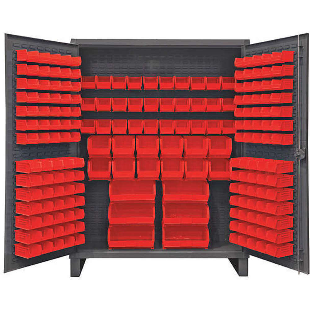 - Durham Manufacturing HDC60-198-1795, industrial storage cabinet features red polypropylene hook-on bins for storing industrial consumables & other items in offices, industries and commercial applications