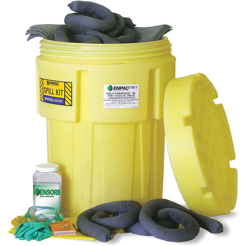 | Includes | (12) Medium Socks, (2) Goggles, (2) Pair Nitrile Gloves, (4) Disposable Bags And Ties, (50) Pads, (8) Large Socks, 1 Gal Ensorb Super Absorbent, 65 Gal Overpack Salvage Drum, Emergency Response Guide, Instruction Sheet, Pack Wipes |