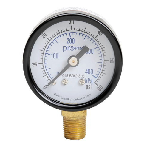 PROSENSE G15-BD60-8LB Mechanical Pressure Gauge, 1.5 Inch Dia., 0 To 60 Psig/0 To 400 Kpa, Black Steel Dry Case