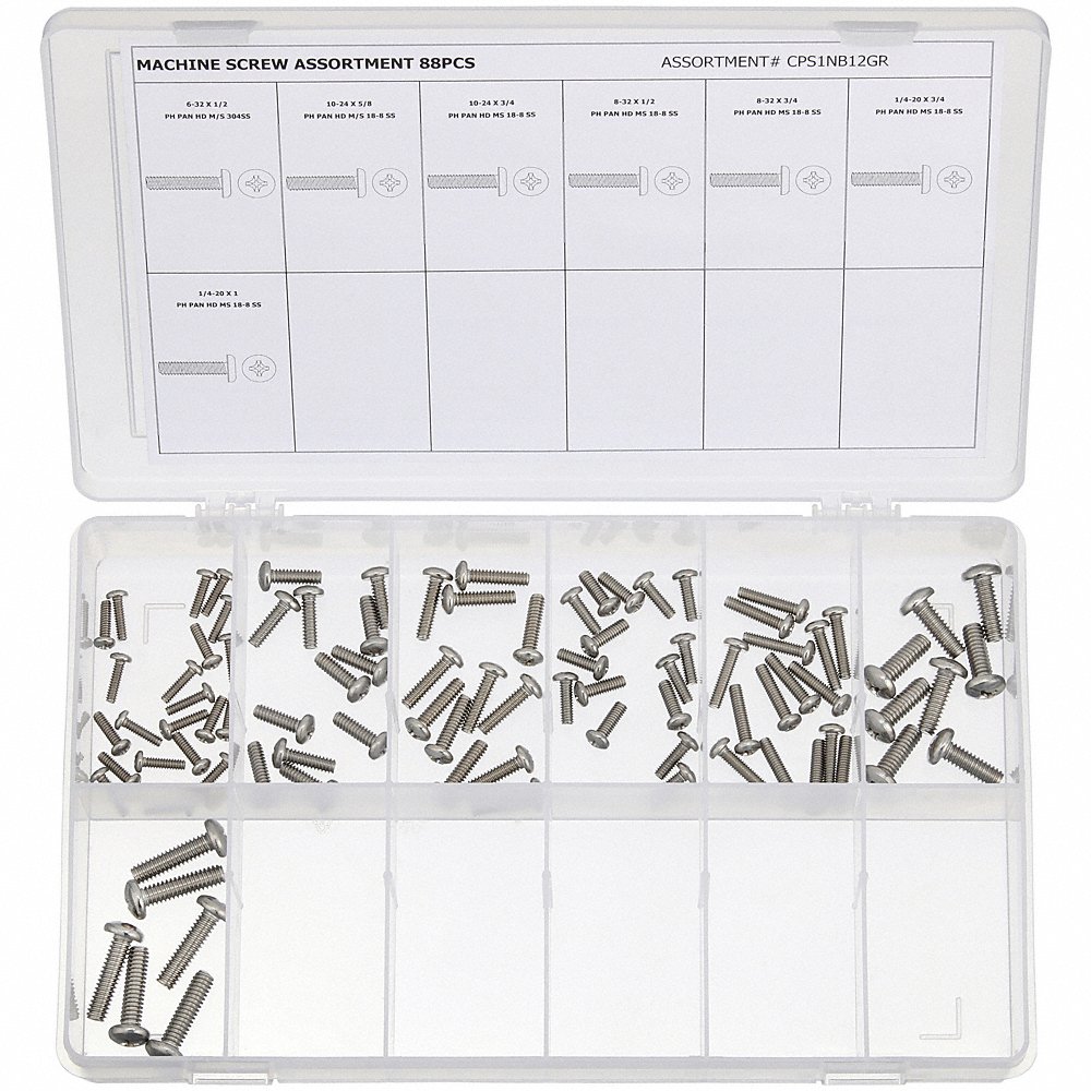 | Includes | (12) Each: 10-24 X 1/2", (15) Each: 8-32 X 1/2", (20) Each: 6-32 X 1/2", (6) Each: 1/4"-20 X 1", (8) Each: 1/4"-20 X 3/4", Plastic Case, X3/4" |