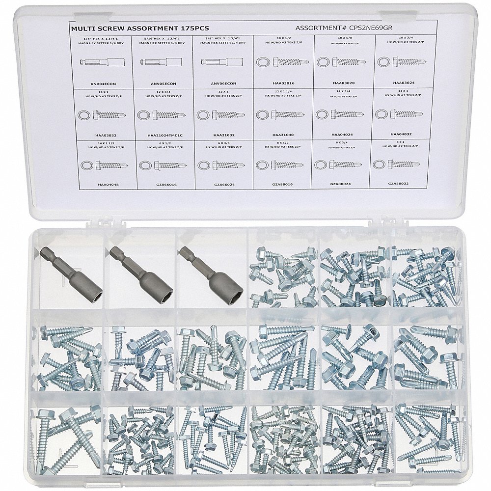 GRAINGER CPS2NE69GR Self Drilling Screw Assortment, Steel, Zn Plated, 199 Pieces, Hex Socket