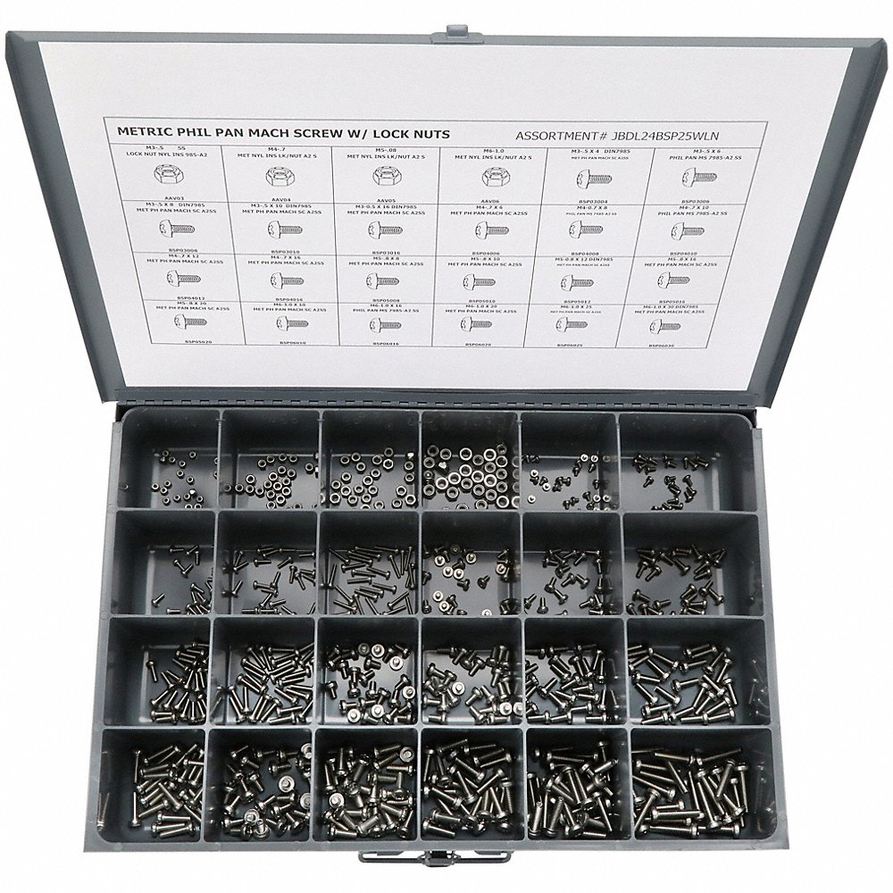 | Includes | 10, 12, 16, 20, 25, 30, 6, 8, M4-0.7X6, M4-0.7, M5-0.8X8, M5-0.8, M6-1.0X10, M6-1.0, Metal Compartment Box With Lid, Nylon Insert Locknut (25) Each: M3-0.5, Phillips Pan Head Screws (25) Each: M3-0.5X4 |