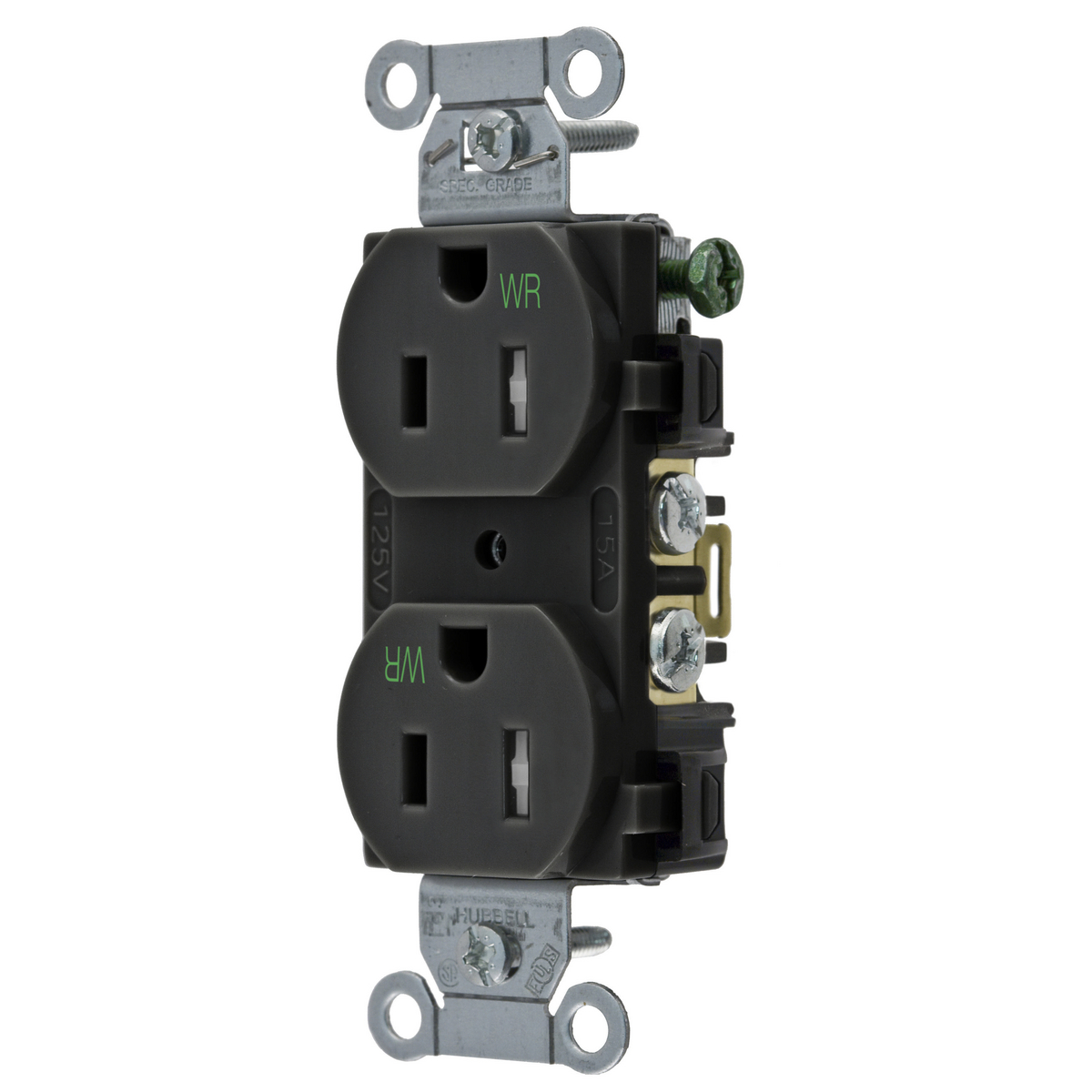HUBBELL WIRING DEVICE-KELLEMS BR15BLKWRTR Straight Receptacle, Duplex, 15A 125V, Black