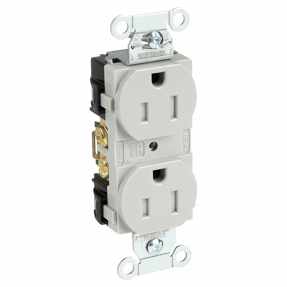 HUBBELL WIRING DEVICE-KELLEMS BR15GRYTR Straight Receptacle, Duplex, 2-Pole 3- Wire Grounding, 15A 125V, Gray