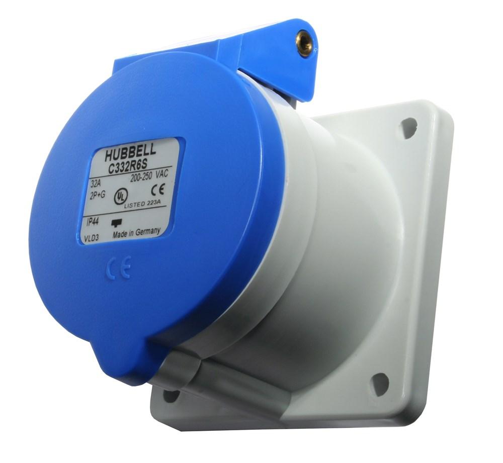 HUBBELL WIRING DEVICE-KELLEMS C332R6SA Heavy Duty Products, IEC Pin and Sleeve Devices, Hubbell-PRO, Female, Receptacle, 32 A 220-240 VAC, 2-POLE 3-WIRE, Blue, Splash Proof