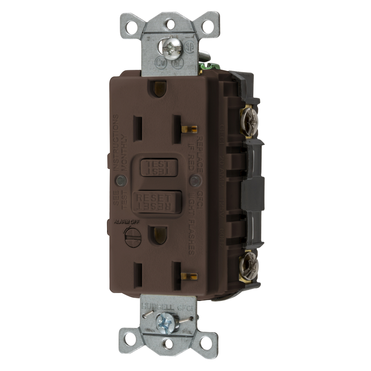 HUBBELL WIRING DEVICE-KELLEMS GFRST20B Gfci Receptacle, 20A 125V, 5-20R, With Alarm, Brown
