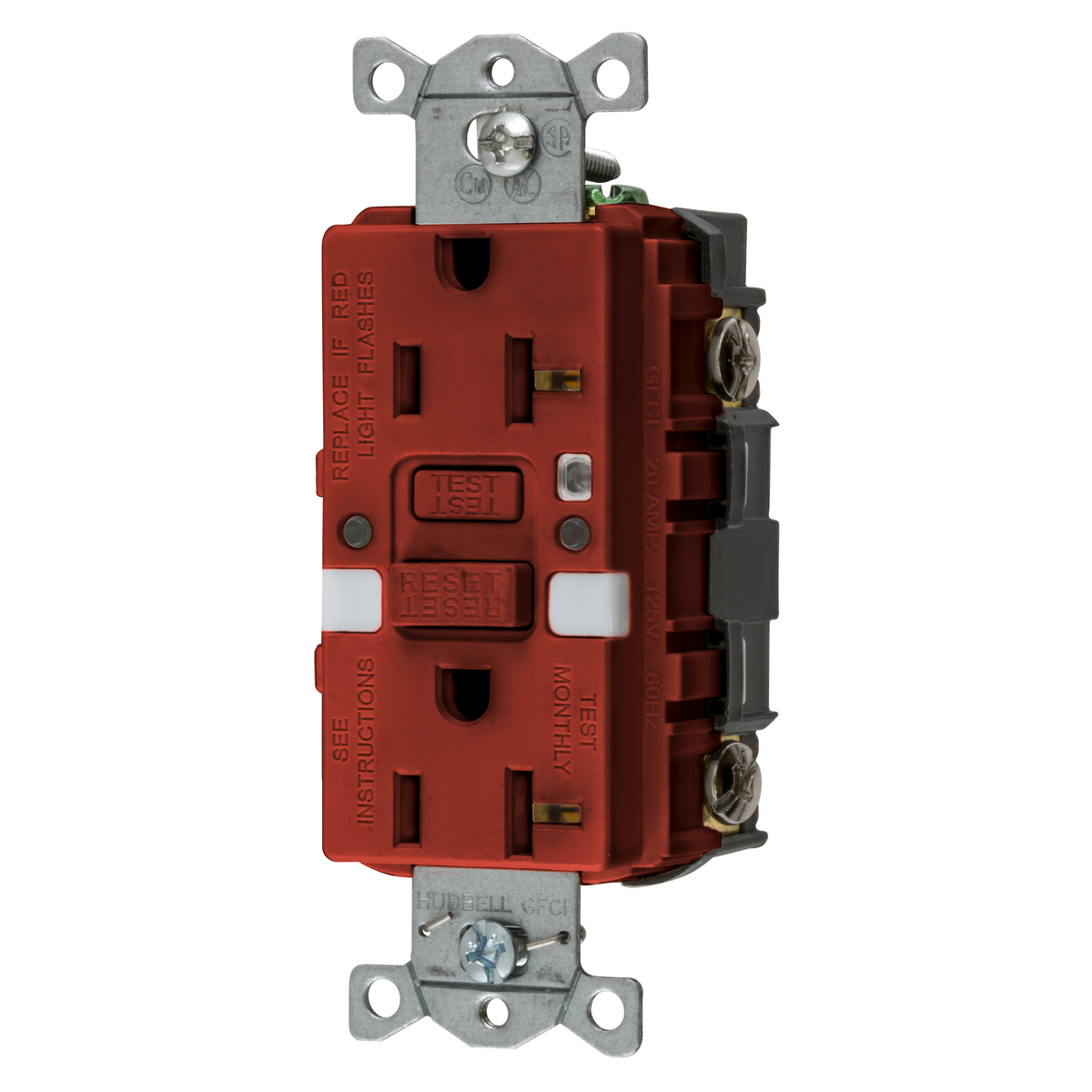 HUBBELL WIRING DEVICE-KELLEMS GFRST20RNL Gfci Receptacle, Self Test, 20A 125V, 5- 20R, With Nightlight, Red
