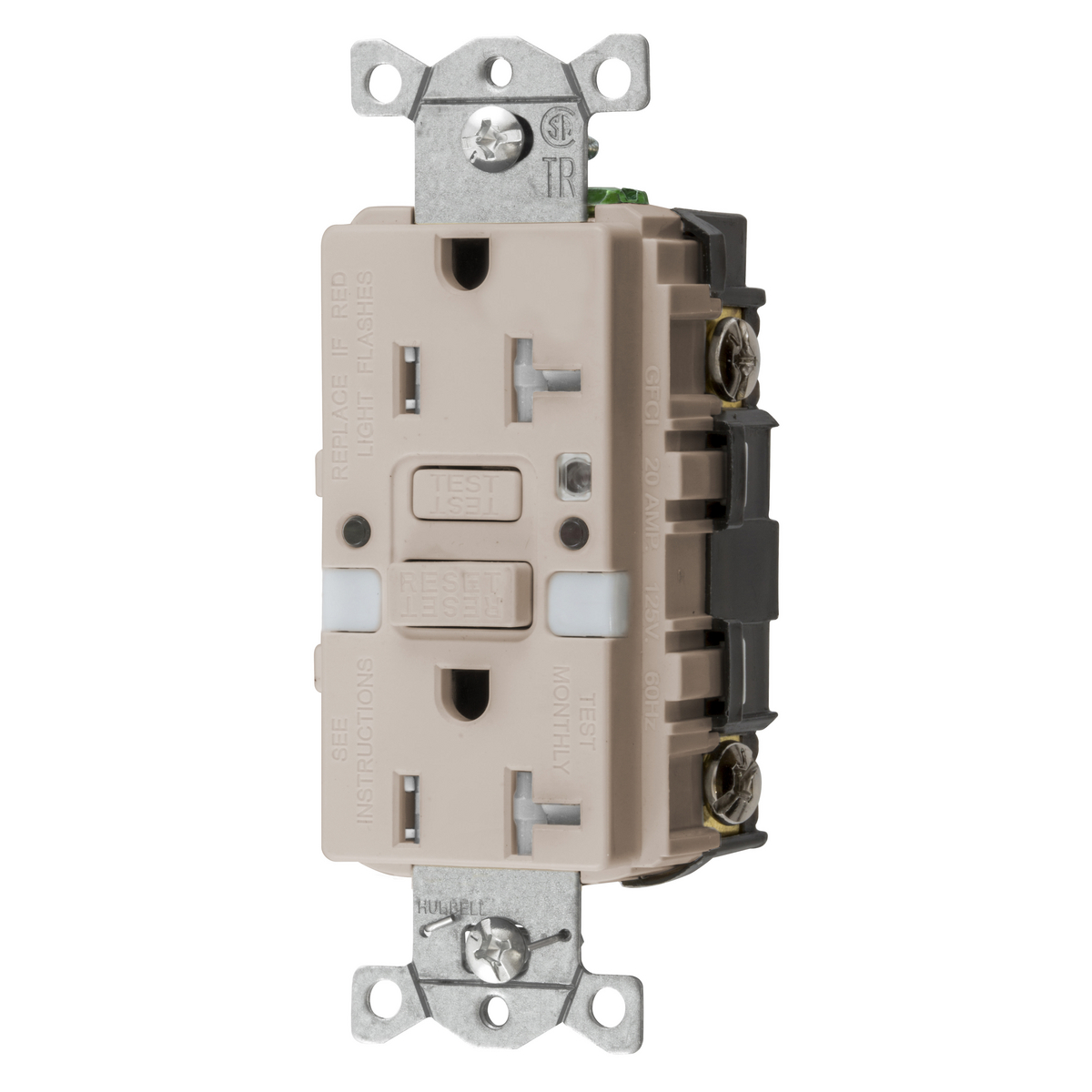HUBBELL WIRING DEVICE-KELLEMS GFTRST20LANL Gfci Receptacle, Self Test, 20A 125V, 5- 20R, With Nightlight, Light Almond