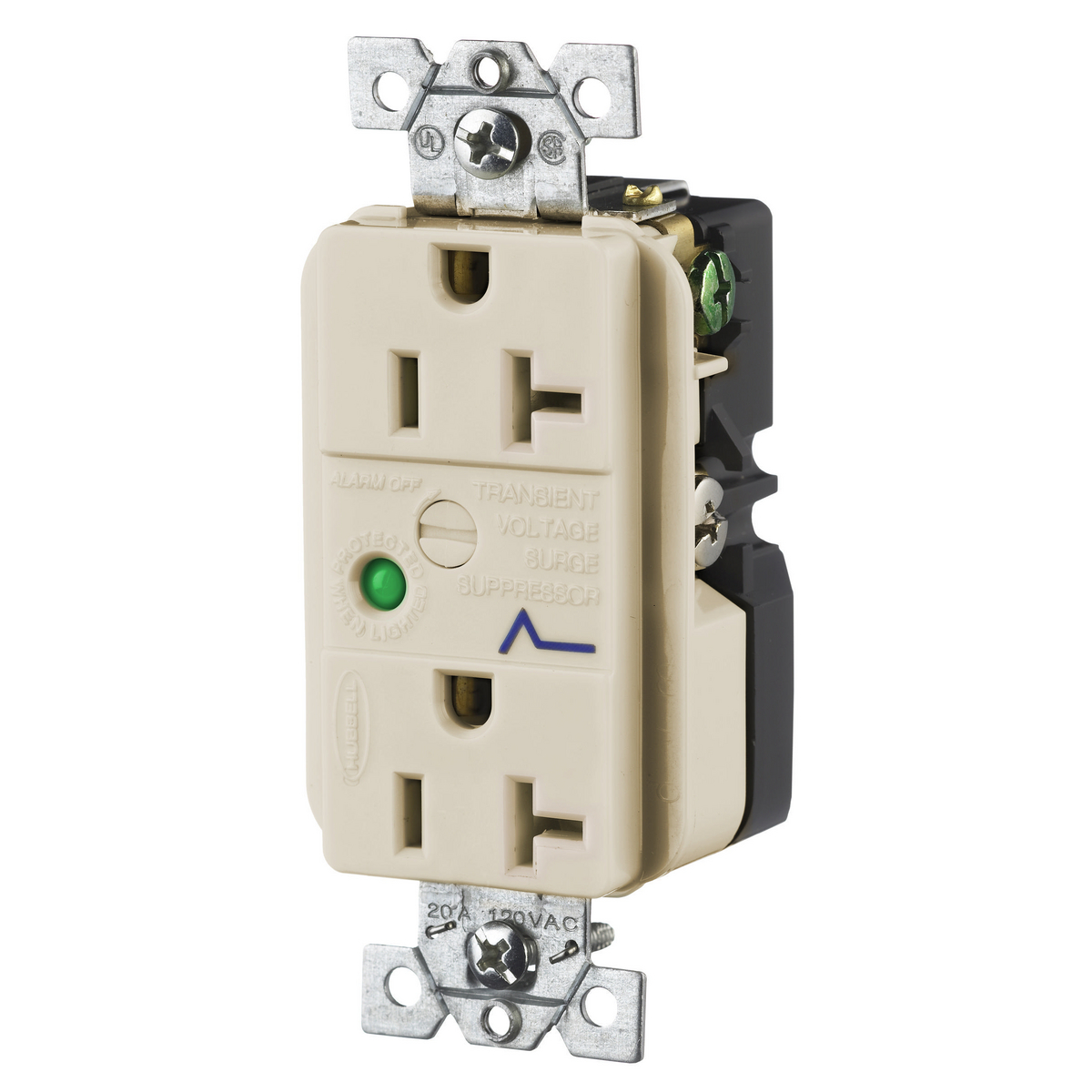 HUBBELL WIRING DEVICE-KELLEMS HBL5362ALSA Duplex Receptacle, 20A, 125V, Almond, With Light And Alarm