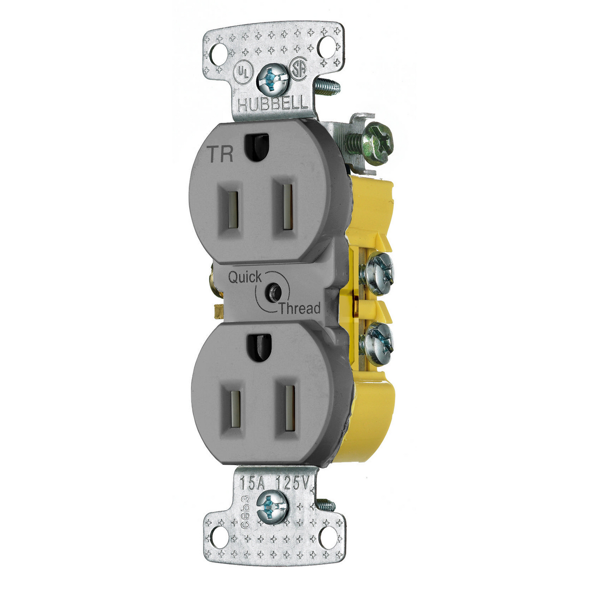 HUBBELL WIRING DEVICE-KELLEMS RR15QGYTR Duplex Receptacle, Tamper Resistant, Quick Plate, 15A, 125V, 2-Pole, Gray
