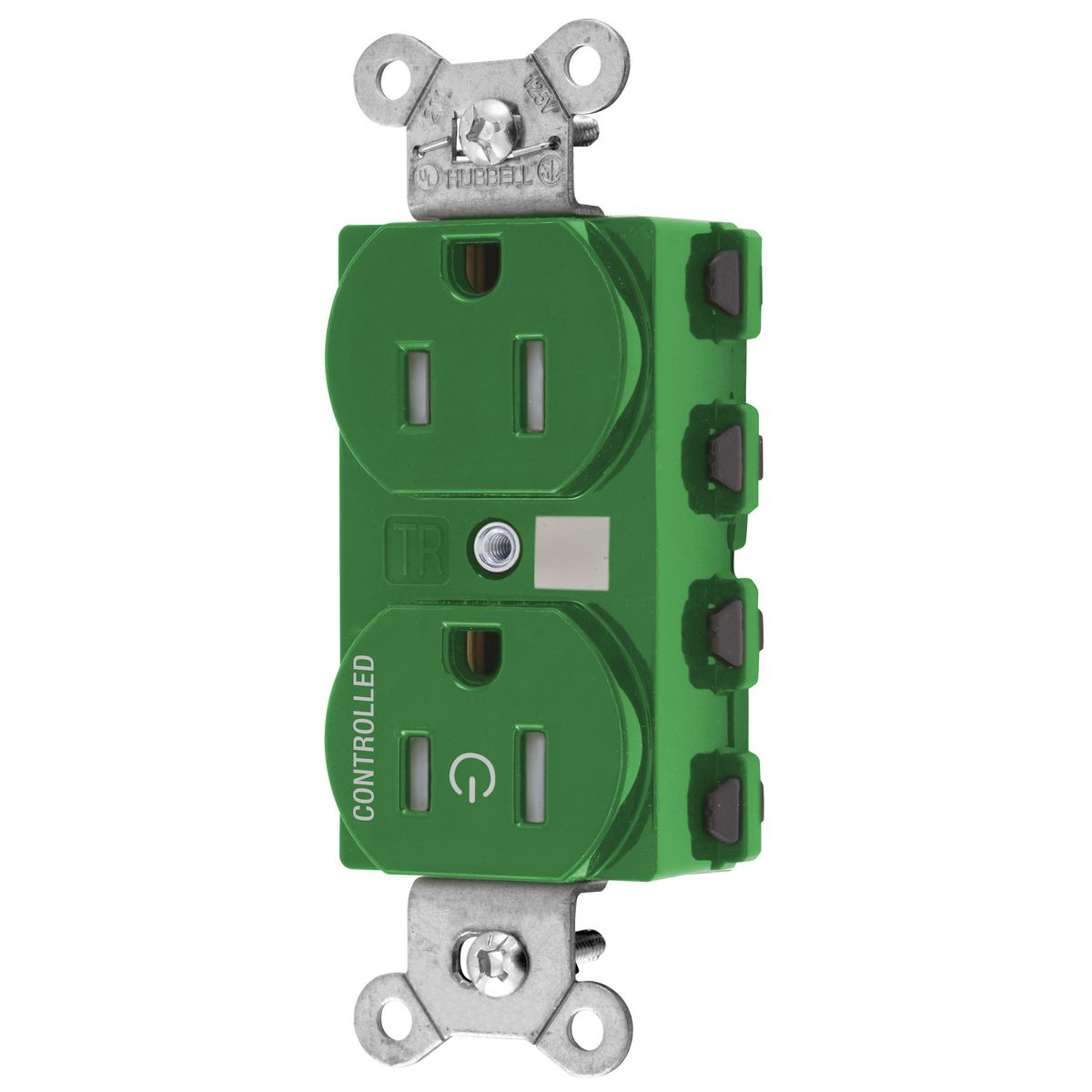 HUBBELL WIRING DEVICE-KELLEMS SNAP5262C1GNTRA Straight Receptacle, Controlled, 15A 125V, 2-Pole 3-Wire Grounding, Nylon, Green