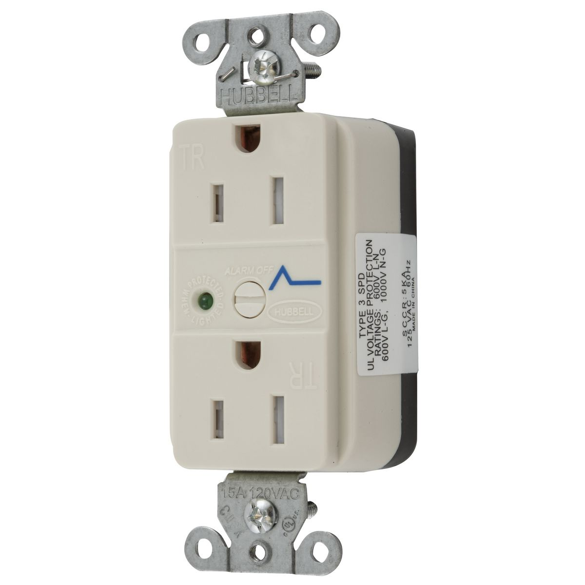 HUBBELL WIRING DEVICE-KELLEMS SNAP5262LAS Straight Receptacle, Led Indicator, 15A 125V, 5-15R, Nylon, Light Almond