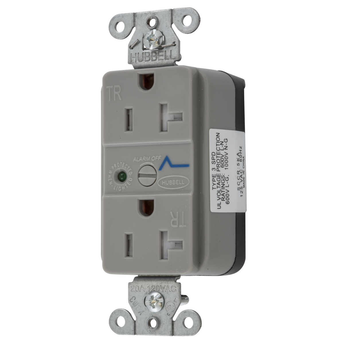 HUBBELL WIRING DEVICE-KELLEMS SNAP5362GYS Straight Receptacle, Led Indicator, 20A 125V, 5-20R, Nylon, Gray