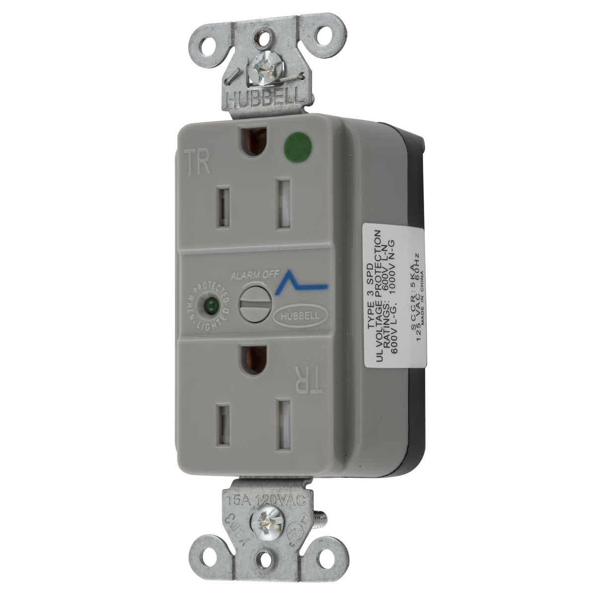 HUBBELL WIRING DEVICE-KELLEMS SNAP8262GYS Straight Receptacle, Duplex, Tamper Resistant, 15A 125V, Nylon, Gray