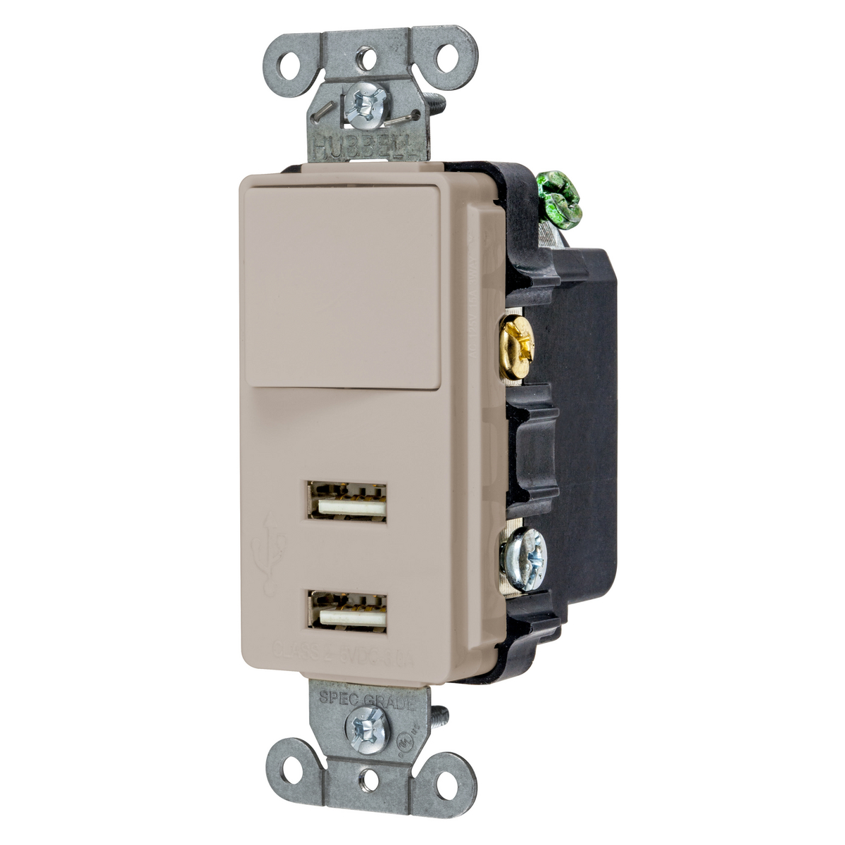 HUBBELL WIRING DEVICE-KELLEMS USB102LA USB Charger, Combo Devices, SinglePole/Three Way Switch, 5V 3A, 4-Port, 15A 120V AC, 2-Pole 3-Wire Grounding, 5-15R, Light Almond