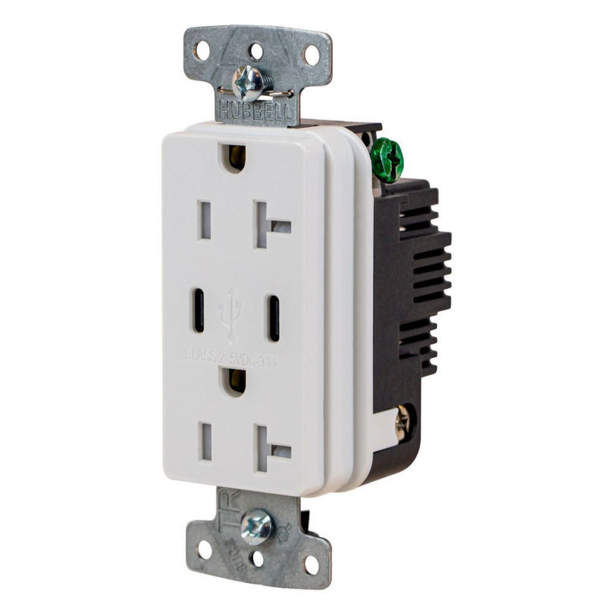 HUBBELL WIRING DEVICE-KELLEMS USB20CW Usb Receptacle, 20A 125V, 2-P 3-W Grounding, 5-20R, Two 3.1 A Usb Port, Brown